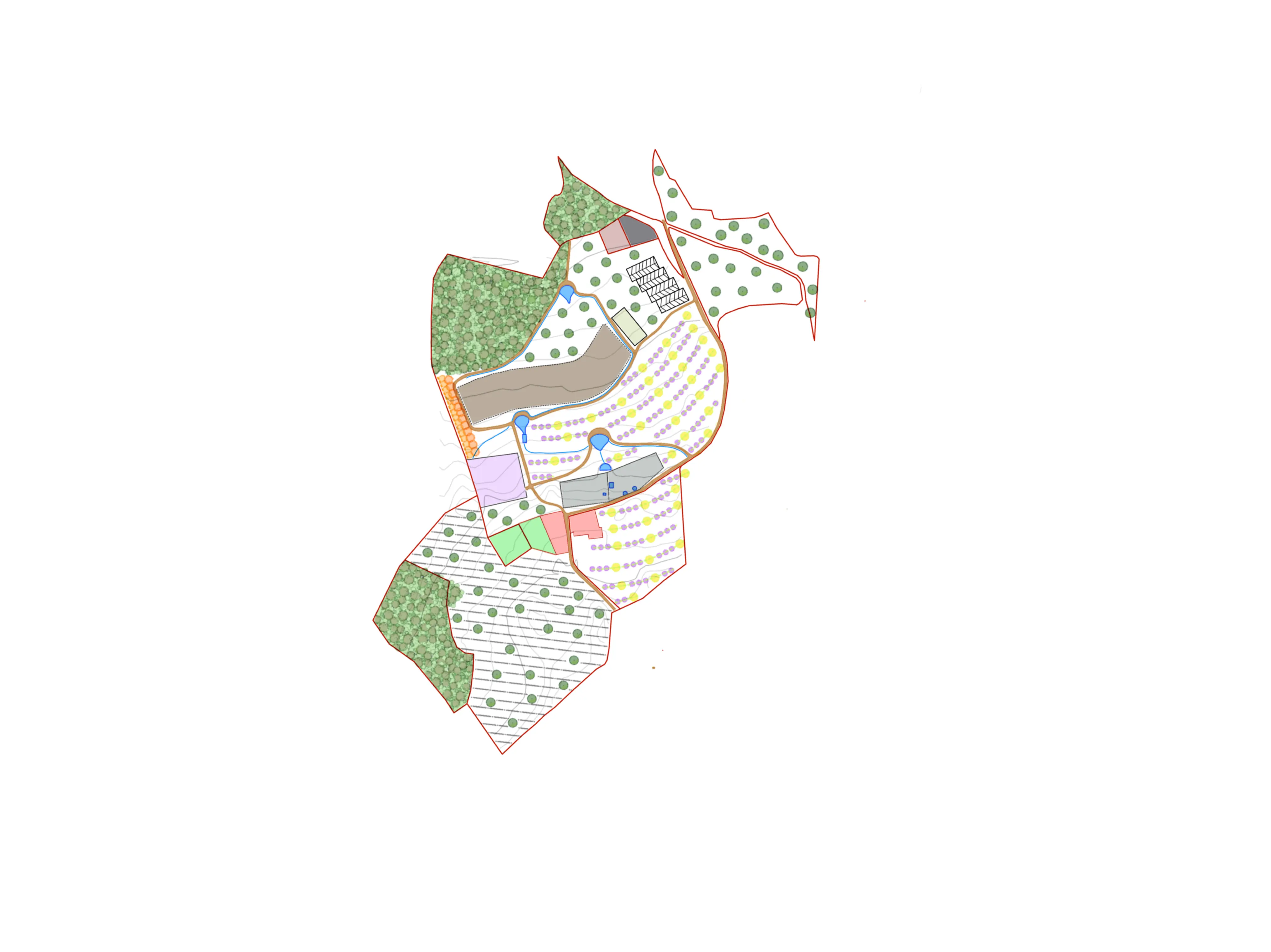 Este proyecto es una granja de agricultura regenerativa totalmente integrada. El diseño se basa en principios de agroecología, manejo holístico y modelos de producción de ciclo cerrado, con el objetivo de crear un ecosistema productivo y resiliente que recupere la salud del suelo y aumenta la biodiversidad. El plan maestro articula agua, suelo, vegetación, fauna y actividad humana dentro de un sistema holístico. Cada elemento del paisaje aporta a un ciclo ecológico autosuficiente que, con el tiempo, regenera y fortalece la tierra.